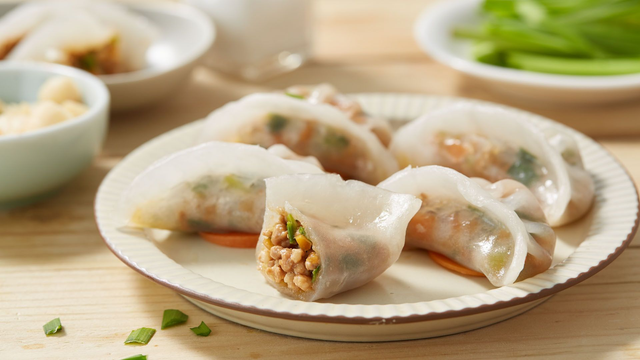 Le Funku au porc est un ravioli vapeur traditionnel, reconnaissable à sa pâte légèrement épaisse et translucide, finement plissée en demi-lune. Sous cette enveloppe souple se cache une farce savoureuse de porc haché, délicatement assaisonnée de ciboule, gingembre et légumes finement coupés.